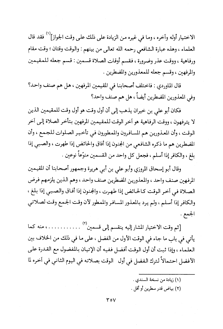 وقال أبو إسحاق المروزي وأبو علي بن أبي هريرة وجمهور أصحابنا أن المقيمين المرفهين صنف واحد، والمعذورين المضطرين صنف واحد، وهم الذين يلزمهم فرض الصلاة في آخر الوقت كالحائض إذا طهرت، والمجنون إذا أفاق والصبي إذا بلغ، والكافر إذا أسلم، ولم يرد بالمعذور المسافر والممطور لأن وقت الجمع وقت لصلاتي الجمع.