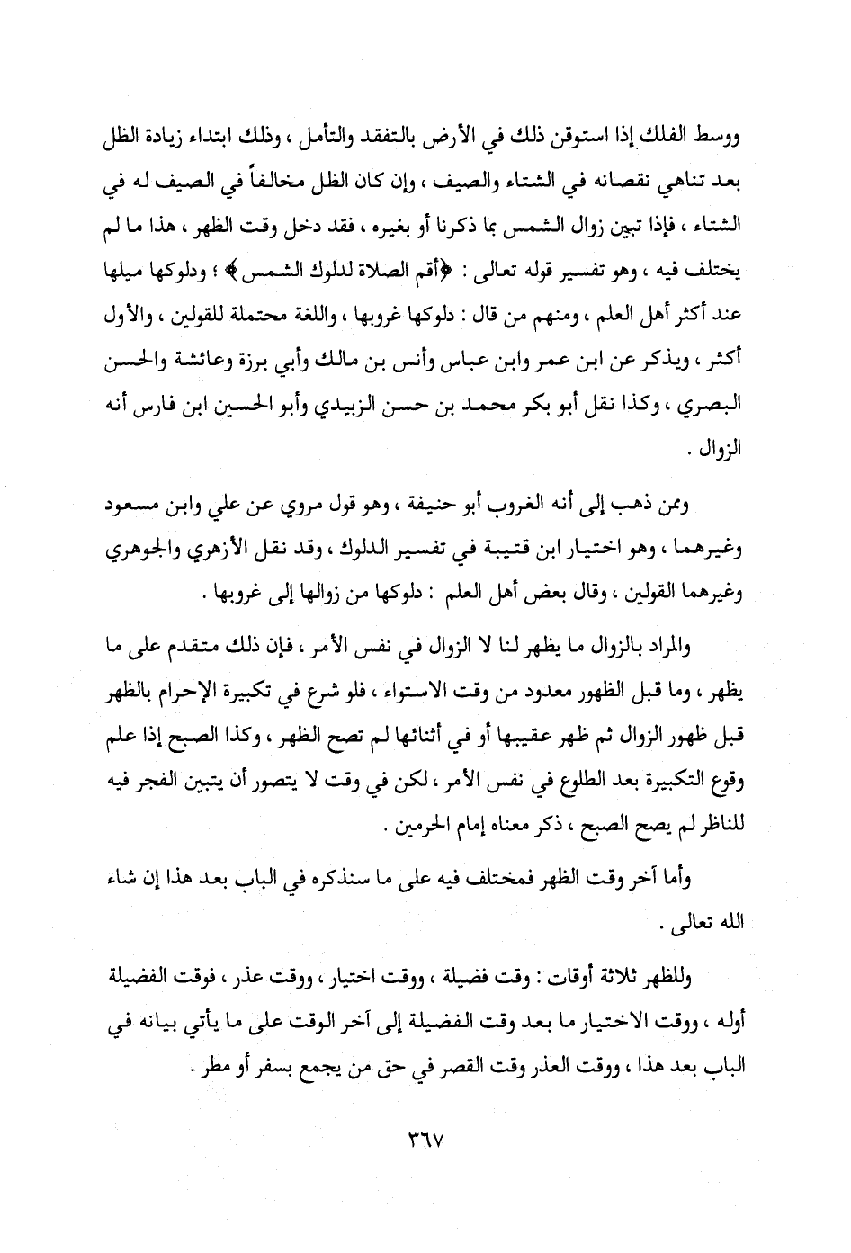 ووسط الفلك إذا استوقن ذلك في الأرض بالتفقد والتأمل، وذلك ابتداء زيادة الظل بعد تناهي نقصانه في الشتاء والصيف، وإن كان الظل مخالفًا في الصيف له في الشتاء، فإذا تبين زوال الشمس بما ذكرنا أو بغيره، فقد دخل وقت الظهر، هذا ما لم يختلف فيه، وهو تفسير قوله تعالى: {أقم الصلاة لدلوك الشمس}؛ ودلوكها ميلها عند أكثر أهل العلم، ومنهم من قال: دلوكها غروبها، واللغة محتملة للقولين، والأول أكثر، ويذكر عن ابن عمر وابن عباس وأنس بن مالك وأبي برزة وعائشة والحسن البصري، وكذا نقل أبو بكر محمد بن حسن الزبيدي وأبو الحسين بن فارس أنه الزوال.