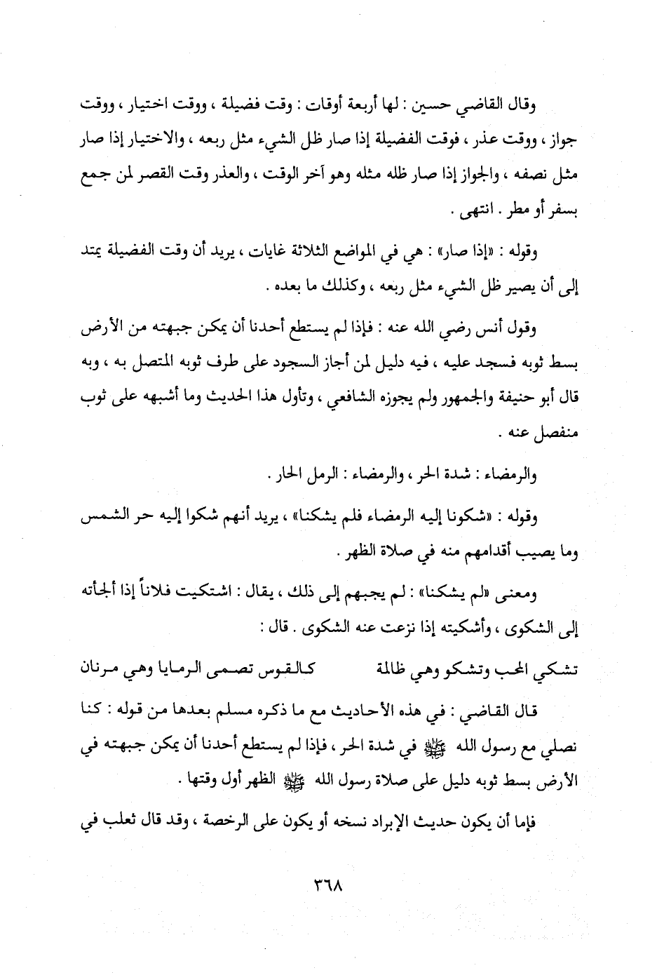 قال القاضي: في هذه الأحاديث مع ما ذكره مسلم بعدها من قوله: كنا نصلي مع رسول الله - صلى الله عليه وسلم - في شدة الحر، فإذا لم يستطع أحدنا أن يمكن جبهته في الأرض بسط ثوبه دليل على صلاة رسول الله - صلى الله عليه وسلم - الظهر أول وقتها.