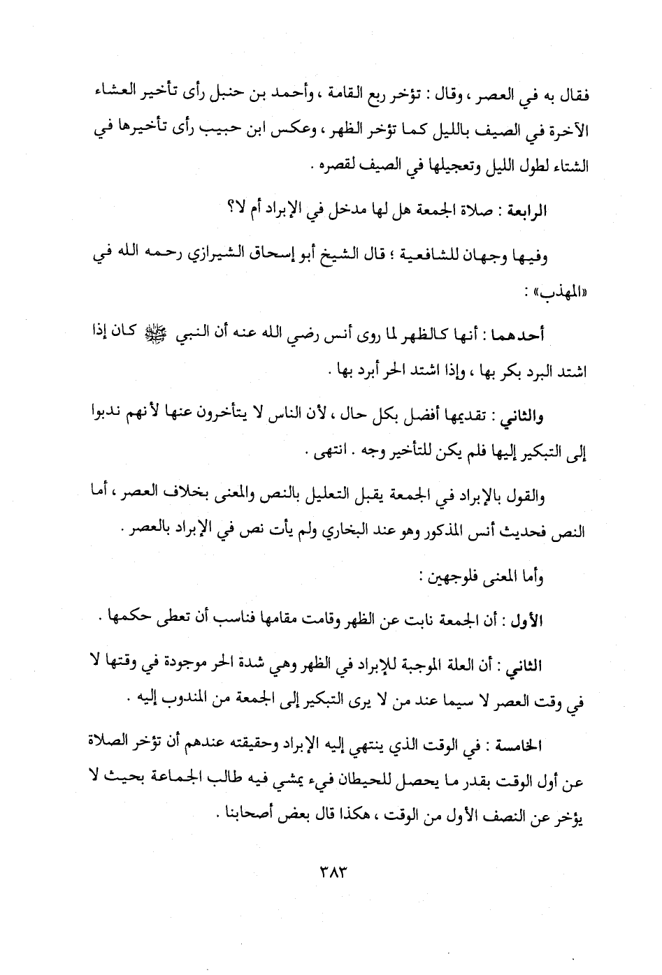 الثاني: أن العلة الموجبة للإبراد في الظهر وهي شدة الحر موجودة في وقتها لا في وقت العصر لا سيما عند من لا يرى التبكير إلى الجمعة من المندوب إليه.