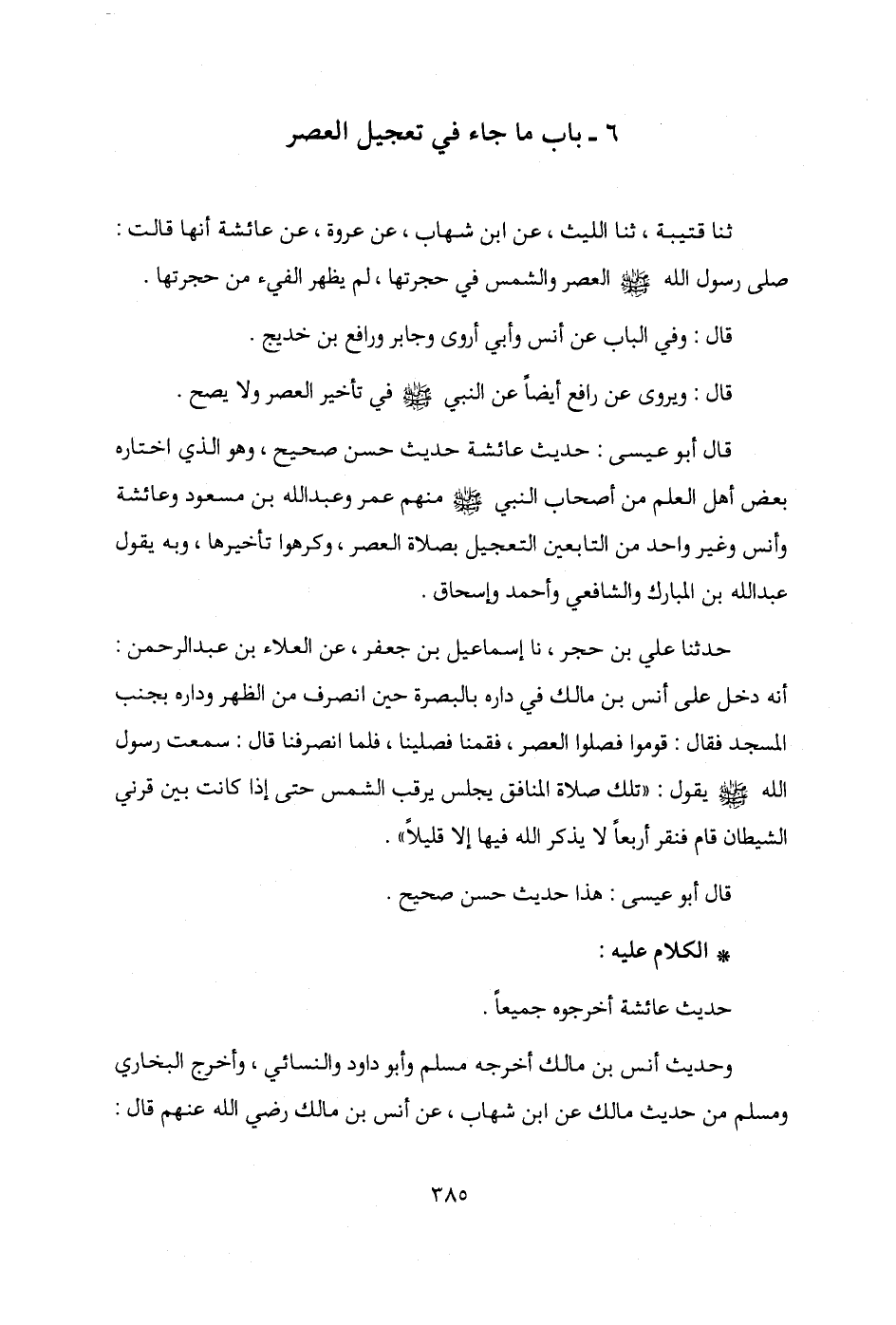 قال أبو عيسى: حديث عائشة حديث حسن صحيح، وهو الذي اختاره بعض أهل العلم من أصحاب النبي - صلى الله عليه وسلم - منهم عمر وعبد الله بن مسعود وعائشة وأنس وغير واحد من التابعين التعجيل بصلاة العصر، وكرهوا تأخيرها، وبه يقول عبد الله بن المبارك والشافعي وأحمد وإسحاق.
