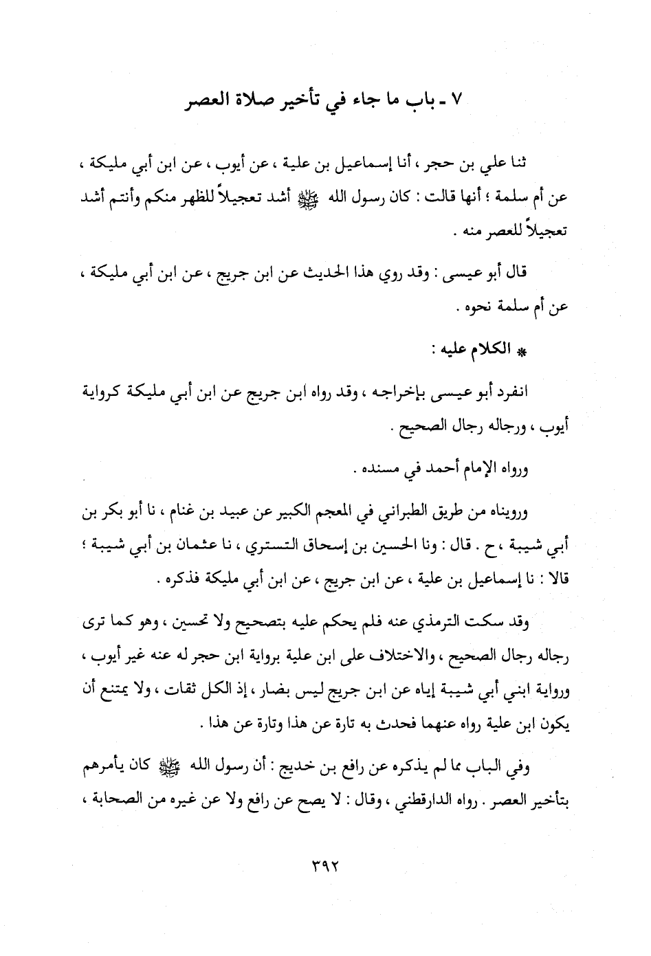 ثنا علي بن حجر، أنا إسماعيل بن علية، عن أيوب، عن ابن أبي مليكة، عن أم سلمة؛ أنها قالت: كان رسول الله - صلى الله عليه وسلم - أشد تعجيلًا للظهر منكم وأنتم أشد تعجيلًا للعصر منه.