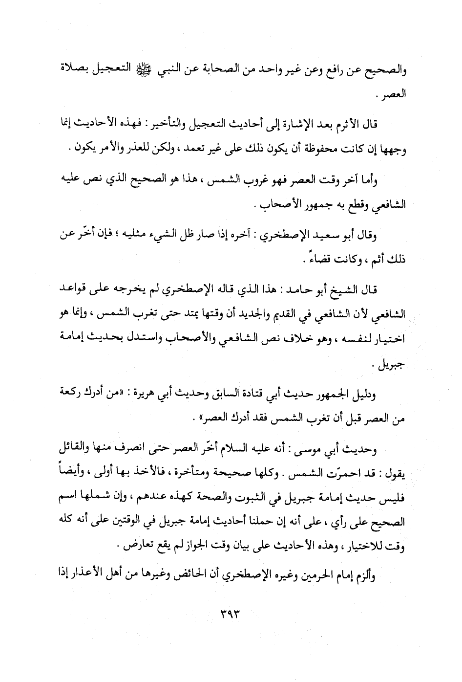 قال الشيخ أبو حامد: هذا الذي قاله الإصطخري لم يخرجه على قواعد الشافعي لأن الشافعي في القديم والجديد أن وقتها يمتد حتى تغرب الشمس، وإنما هو اختيار لنفسه، وهو خلاف نص الشافعي والأصحاب واستدل بحديث إمامة جبريل.