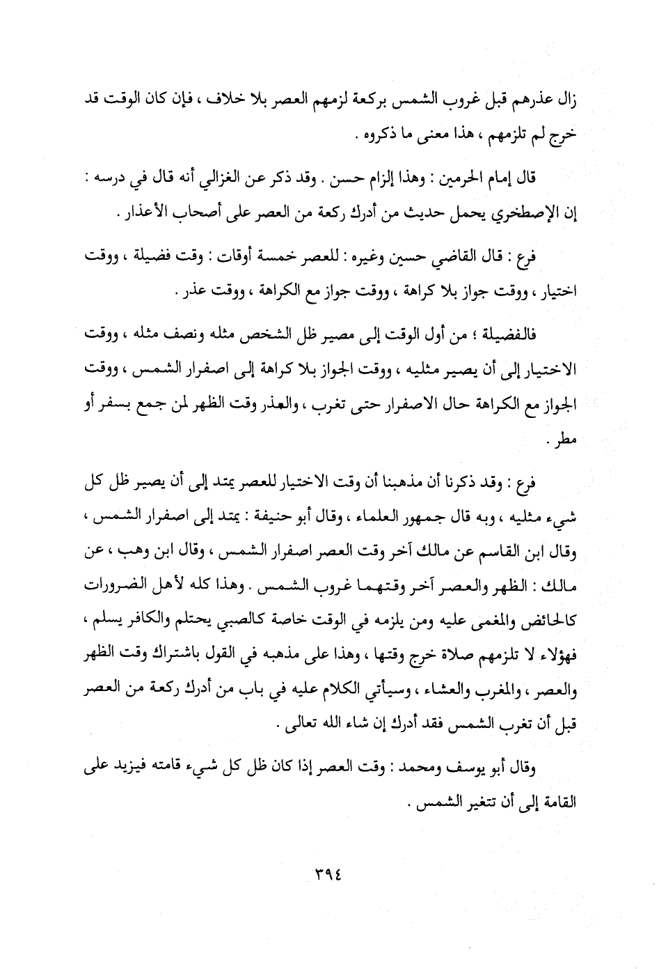 فرع: وقد ذكرنا أن مذهبنا أن وقت الاختيار للعصر يمتد إلى أن يصير ظل كل شيء مثليه، وبه قال جمهور العلماء، وقال أبو حنيفة: يمتد إلى اصفرار الشمس، وقال ابن القاسم عن مالك آخر وقت العصر اصفرار الشمس، وقال ابن وهب، عن مالك: الظهر والعصر آخر وقتهما غروب الشمس. وهذا كله لأهل الضرورات كالحائض والمغمى عليه ومن يلزمه في الوقت خاصة كالصبي يحتلم والكافر يسلم، فهؤلاء لا تلزمهم صلاة خرج وقتها، وهذا على مذهبه في القول باشتراك وقت الظهر والعصر، والمغرب والعشاء، وسيأتي الكلام عليه في باب من أدرك ركعة من العصر قبل أن تغرب الشمس فقد أدرك إن شاء الله تعالى.