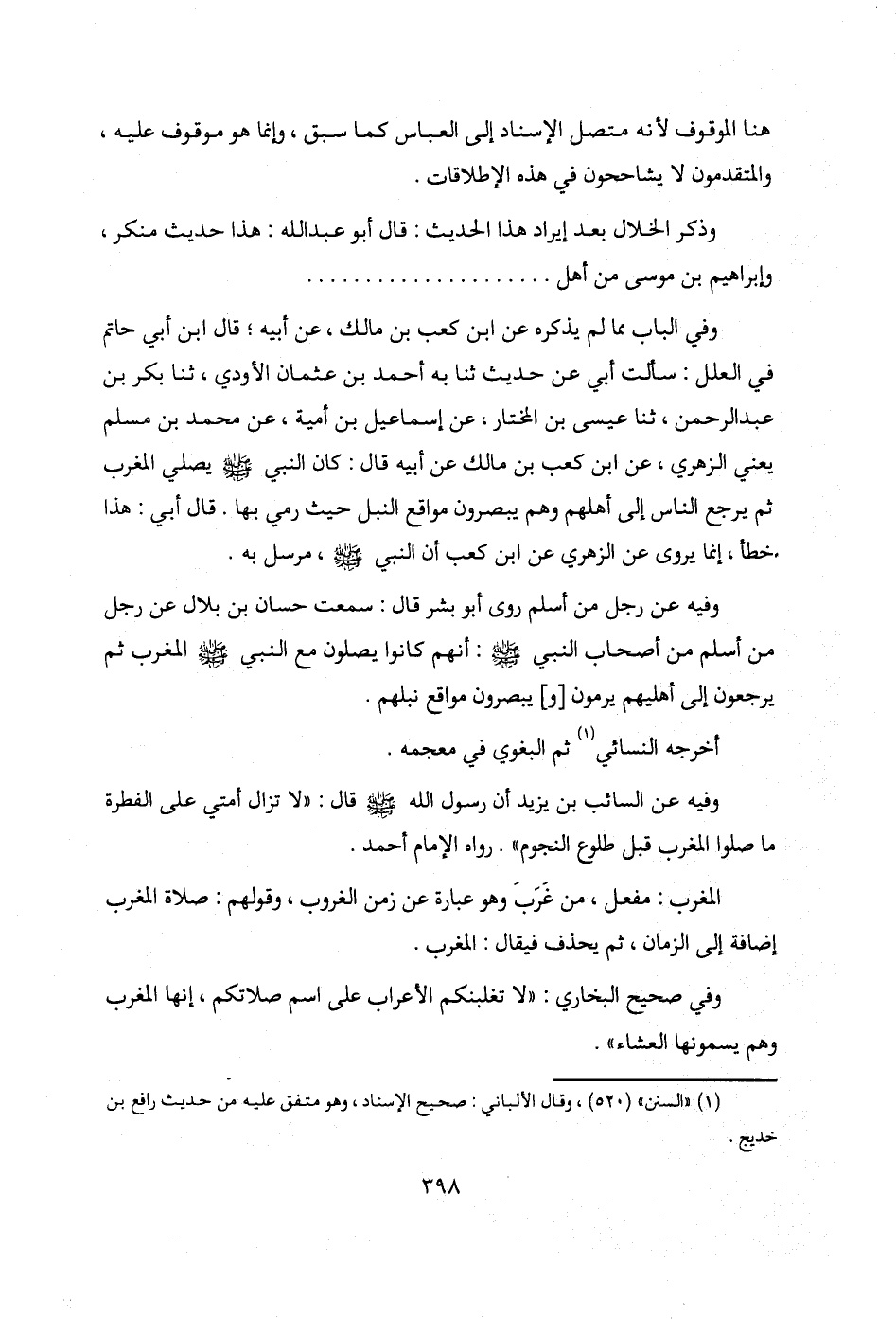 وفي الباب مما لم يذكره عن ابن كعب بن مالك، عن أبيه؛ قال ابن أبي حاتم في العلل: سألت أبي عن حديث ثنا به أحمد بن عثمان الأودي، ثنا بكر بن عبد الرحمن، ثنا عيسى بن المختار، عن إسماعيل بن أمية، عن محمد بن مسلم يعني الزهري، عن ابن كعب بن مالك عن أبيه قال: كان النبي - صلى الله عليه وسلم - يصلي المغرب ثم يرجع الناس إلى أهلهم وهم يبصرون مواقع النبل حيث رمي بها. قال أبي: هذا "خطأ، إنما يروى عن الزهري عن ابن كعب أن النبي - صلى الله عليه وسلم -، مرسل به.