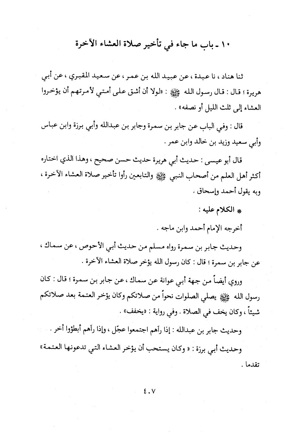 قال أبو عيسى: حديث أبي هريرة حديث حسن صحيح، وهذا الذي اختاره أكثر أهل العلم من أصحاب النبي - صلى الله عليه وسلم - والتابعين رأوا تأخير صلاة العشاء الآخرة، وبه يقول أحمد وإسحاق.
