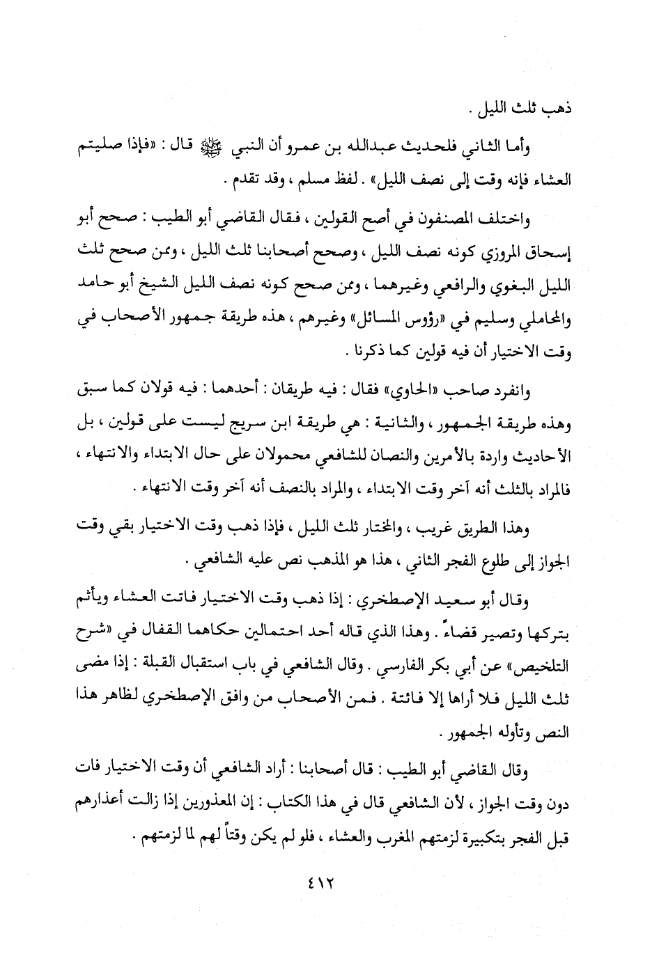 واختلف المصنفون في أصح القولين، فقال القاضي أبو الطيب: صحح أبو إسحاق المروزي كونه نصف الليل، وصحح أصحابنا ثلث الليل، وممن صحح ثلث الليل البغوي والرافعي وغيرهما، وممن صحح كونه نصف الليل الشيخ أبو حامد والمحاملي وسليم في "رؤوس المسائل" وغيرهم، هذه طريقة جمهور الأصحاب في وقت الاختيار أن فيه قولين كما ذكرنا.