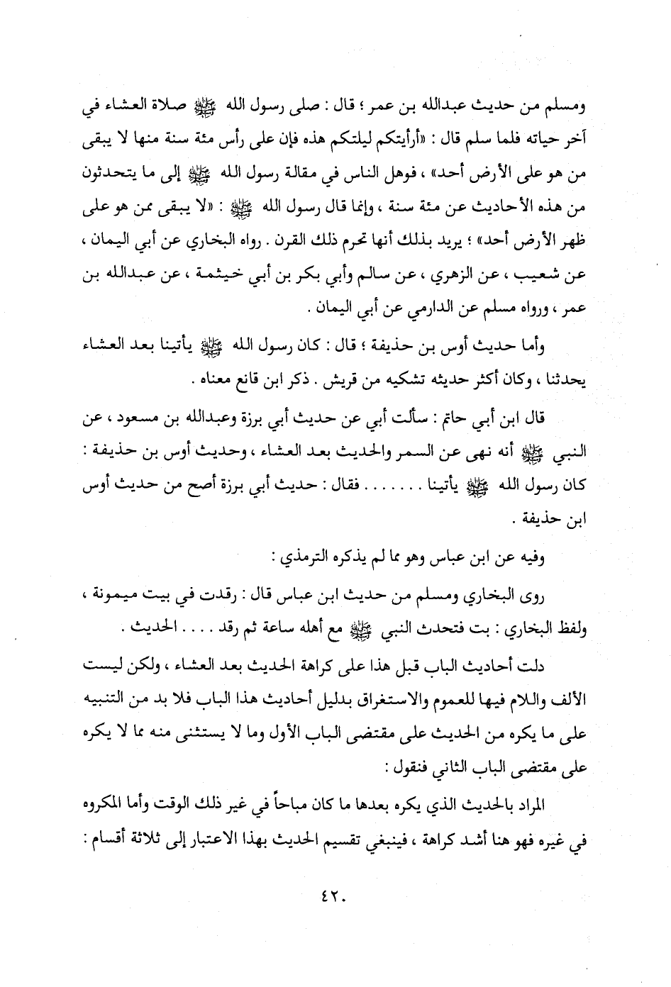 المراد بالحديث الذي يكره بعدها ما كان مباحًا في غير ذلك الوقت وأما المكروه في غيره فهو هنا أشد كراهة، فينبغي تقسيم الحديث بهذا الاعتبار إلى ثلاثة أقسام: