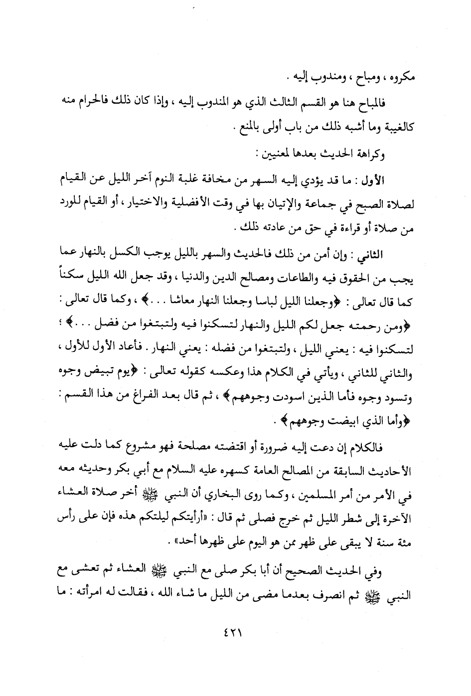 فالكلام إن دعت إليه ضرورة أو اقتضته مصلحة فهو مشروع كما دلت عليه الأحاديث السابقة من المصالح العامة كسهره - عليه السلام - مع أبي بكر وحديثه معه في الأمر من أمر المسلمين، وكما روى البخاري أن النبي - صلى الله عليه وسلم - أخر صلاة العشاء الآخرة إلى شطر الليل ثم خرج فصلى ثم قال: "أرأيتكم ليلتكم هذه فإن على رأس مئة سنة لا يبقى على ظهر ممن هو اليوم على ظهرها أحد".