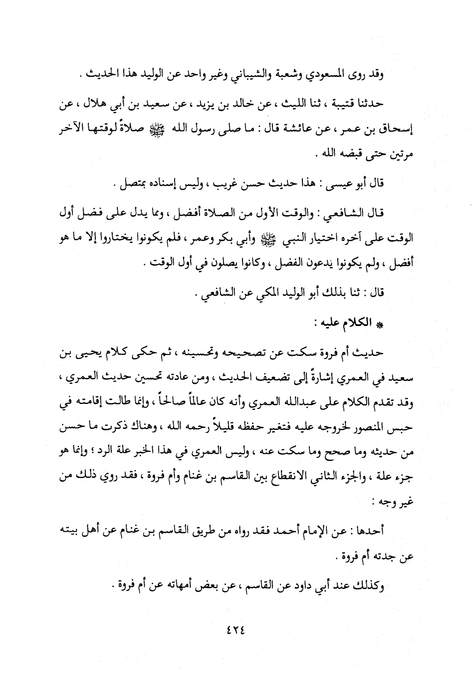 حديث أم فروة سكت عن تصحيحه وتحسينه، ثم حكى كلام يحيى بن سعيد في العمري إشارةً إلى تضعيف الحديث، ومن عادته تحسين حديث العمري، وقد تقدم الكلام على عبد الله العمري وأنه كان عالمًا صالحًا، وإنما طالت إقامته في حبس المنصور لخروجه عليه فتغير حفظه قليلًا رحمه الله، وهناك ذكرت ما حسن من حديثه وما صحح وما سكت عنه، وليس العمري في هذا الخبر علة الرد؛ وإنما هو جزء علة، والجزء الثاني الانقطاع بين القاسم بن غنام وأم فروة، فقد روي ذلك من غير وجه: