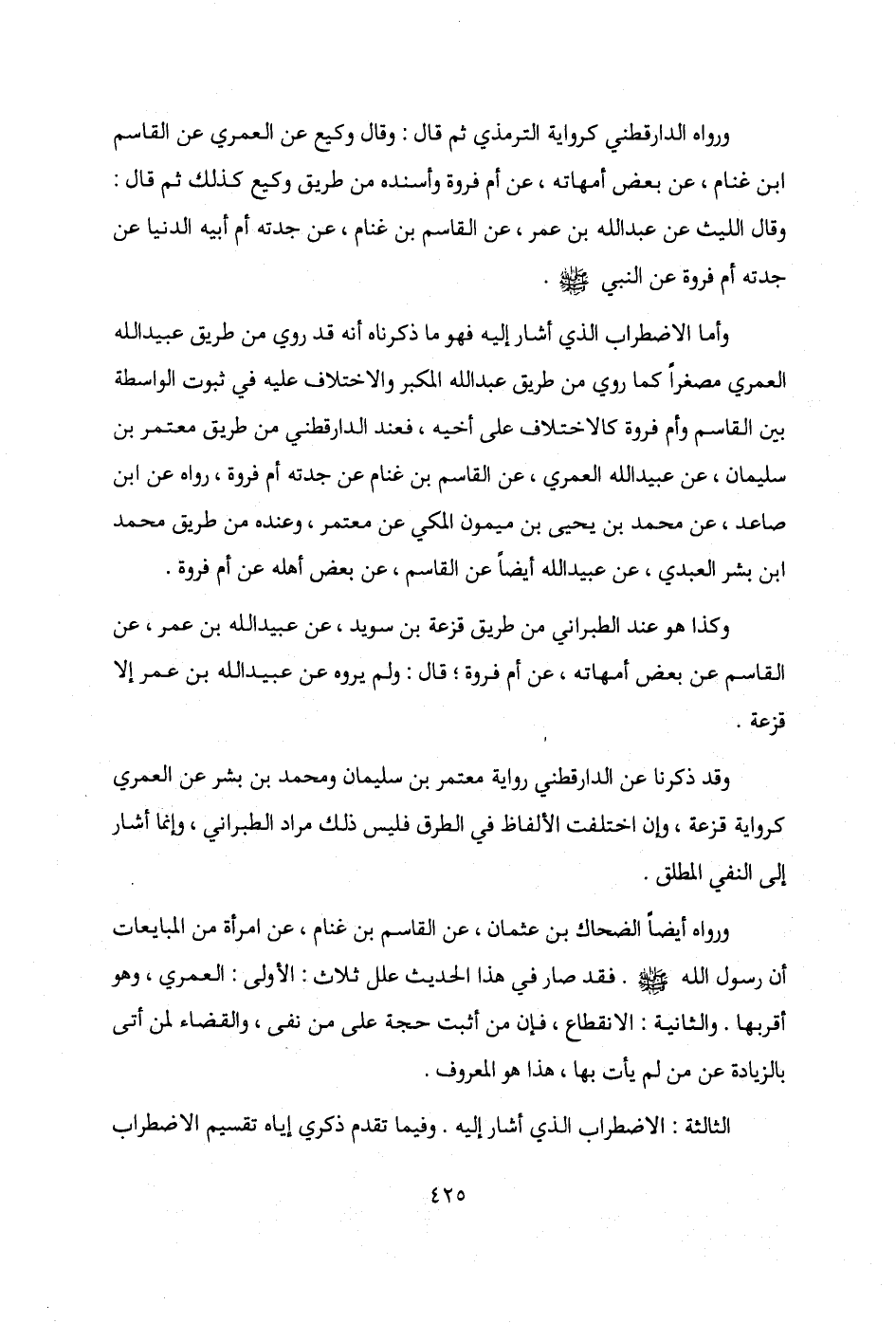 ورواه الدارقطني كرواية الترمذي ثم قال: وقال وكيع عن العمري عن القاسم بن غنام، عن بعض أمهاته، عن أم فروة وأسنده من طريق وكيع كذلك ثم قال: وقال الليث عن عبد الله بن عمر، عن القاسم بن غنام، عن جدته أم أبيه الدنيا عن جدته أم فروة عن النبي - صلى الله عليه وسلم -.