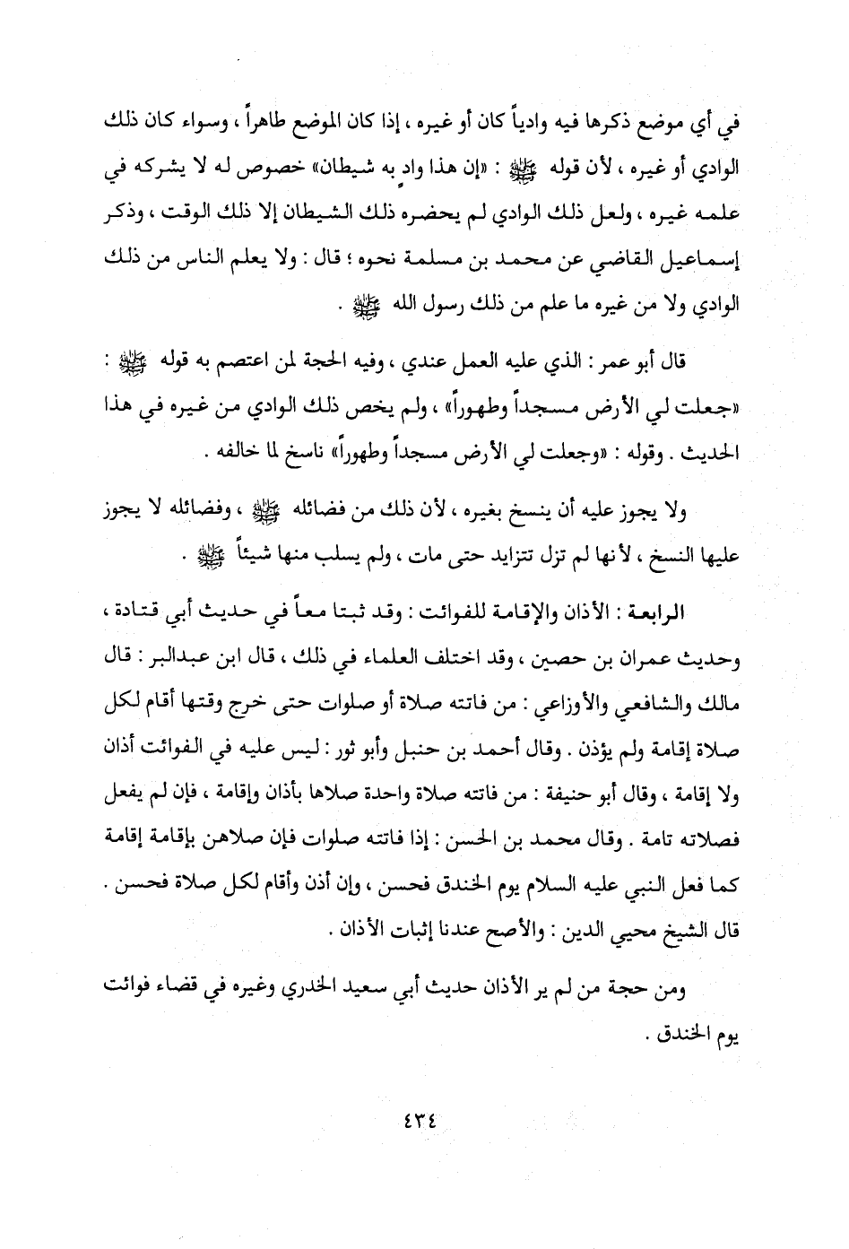قال أبو عمر: الذي عليه العمل عندي، وفيه الحجة لمن اعتصم به قوله - صلى الله عليه وسلم -: "جعلت لي الأرض مسجدًا وطهورًا"، ولم يخص ذلك الوادي من غيره في هذا الحديث. وقوله: "وجعلت لي الأرض مسجدًا وطهورًا" ناسخ لما خالفه.