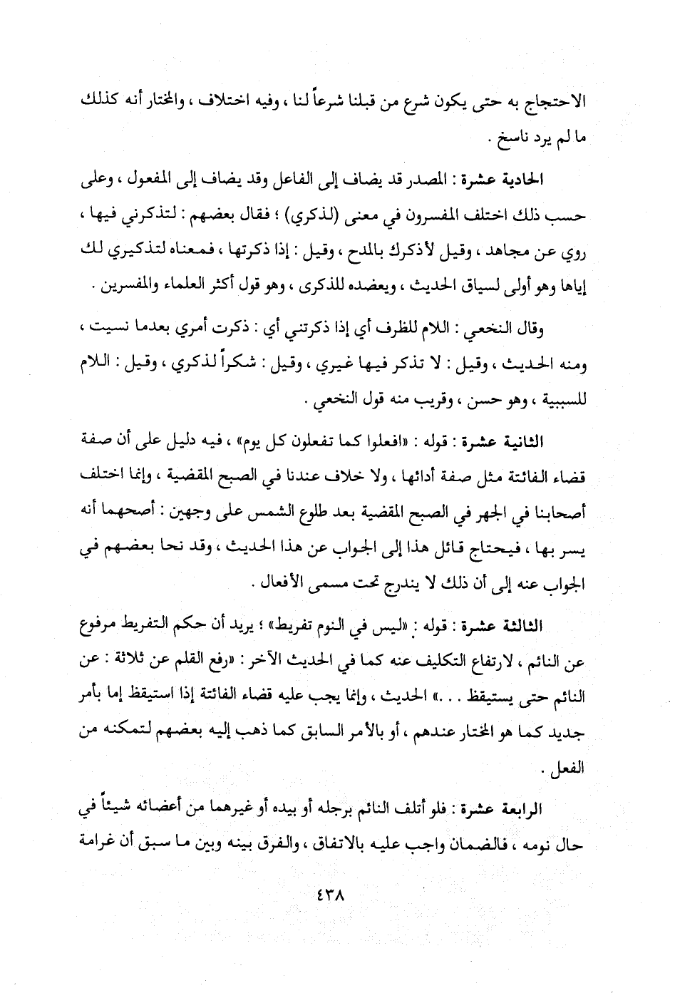 الثالثة عشرة: قوله: "ليس في النوم تفريط"؛ يريد أن حكم التفريط مرفوع عن النائم، لارتفاع التكليف عنه كما في الحديث الآخر: "رفع القلم عن ثلاثة: عن النائم حتى يستيقظ ... " الحديث، وإنما يجب عليه قضاء الفائتة إذا استيقظ إما بأمر جديد كما هو المختار عندهم، أو بالأمر السابق كما ذهب إليه بعضهم لتمكنه من الفعل.