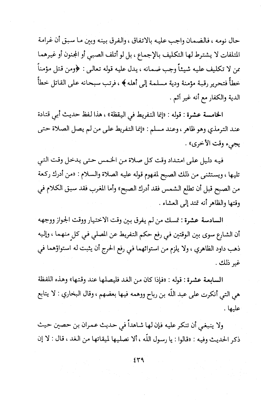 الخامسة عشرة: قوله: "إنما التفريط في اليقظة"، هذا لفظ حديث أبي قتادة عند الترمذي وهو ظاهر، وعند مسلم: "إنما التفريط على من لم يصل الصلاة حشى يجيء وقت الأخرى".