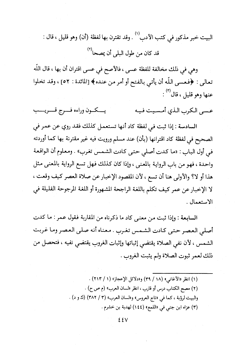 السادسة: إذا ثبت في لفظة كاد أنها تستعمل كذلك فقد روي عن عمر في الصحيح في لفظة كاد اقترانها (بأن) عند مسلم ورويت فيه غير مقترنة بها كما أوردته في أول الباب: "ما كدت أصلي حتى كادت الشمس تغرب". ومعلوم أن الواقعة واحدة، فهو من باب الرواية بالمعنى، وإذا كان كذلك فهل تسع الرواية بالمعنى مثل هذا أو لا؟ والأولى هنا أن تسع، لأن المقصود الإخبار عن صلاة العصر كيف وقعت، لا الإخبار عن عمر كيف تكلم باللغة الراجحة المشهورة أو اللغة المرجوحة القليلة في الاستعمال.