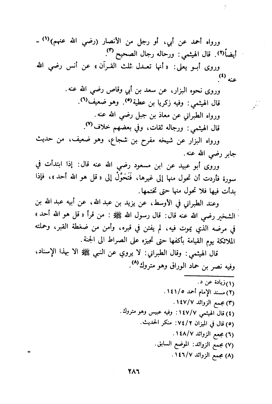 الشخير رضي الله عنه قال: قال رسول الله - صلى الله عليه وسلم -: من قرأ " قل هو الله أحد " في مرضه الذي يموت فيه، لم يفتن في قبره، وأمن من ضغطة القبر، وحملته الملائكة يوم القيامة بأكفها حتى تجيزه على الصراط إلى الجنة.