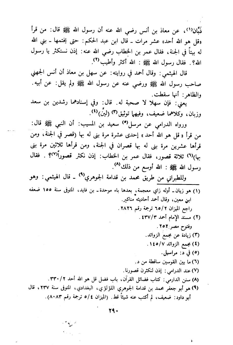 زبَّان، عن معاذ بن أنس رضي الله عنه أن رسول الله - صلى الله عليه وسلم - قال: من قرأ "قُلْ هُوَ اللَّهُ أَحَدٌ" عشر مرات - قال ابن عبد الحكم: حتى يختمها - بني الله له بيتا في الجنة، فقال عمر بن الخطاب رضي الله عنه: إذن نستكثر يا رسول الله؟.
