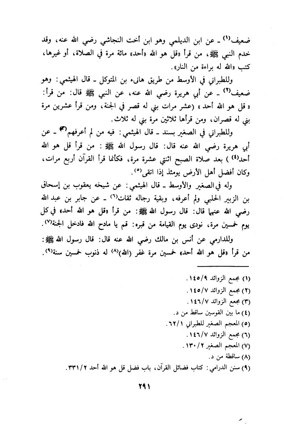 رضي الله عنهما قال: قال رسول الله - صلى الله عليه وسلم -: من قرأ (قُلْ هُوَ اللَّهُ أَحَدٌ) في كل يوم خمسين مرة، نودى يوم القيامة من قبره: قم يا مادح الله فادخل الجنة.