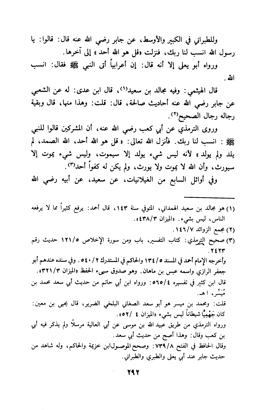 - صلى الله عليه وسلم -: انسب لنا ربك. فأنزل الله تعالى: (قل هو الله أحد، الله الصمد، لم يلد ولم يولد) لأنه ليس شيء يولد إلا سيموت، وليس شيء يموت إلا سيورث، وأن الله لا يموت ولا يورث، ولم يكن له كفواً أحد.
