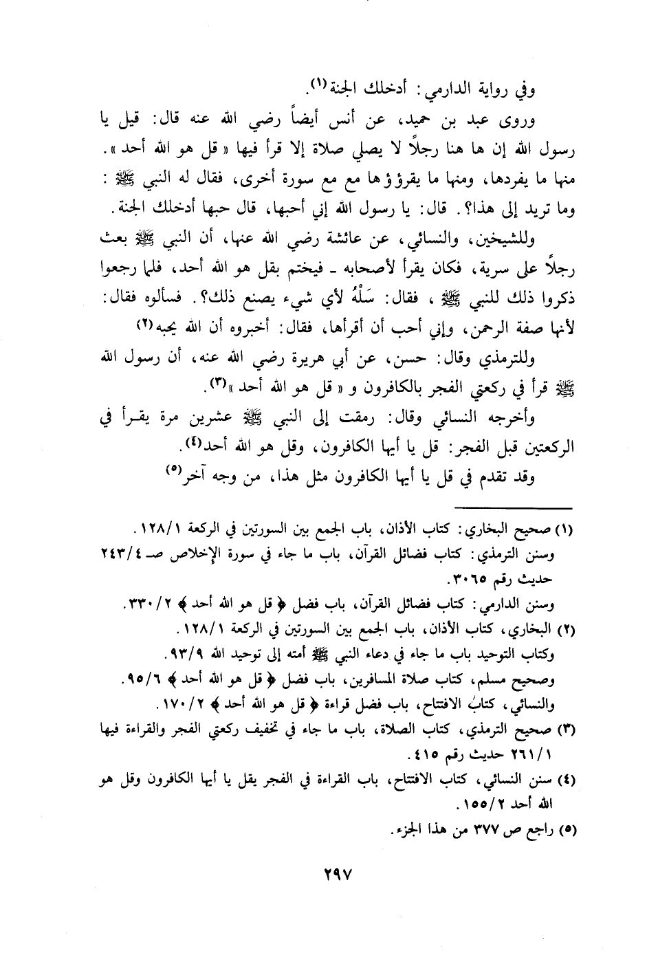 وللشيخين، والنَّسائي، عن عائشة رضي الله عنها، أن النبي - صلى الله عليه وسلم - بعث رجلاً على سرية، فكان يقرأ لأصحابه - فيختم بـ "قُلْ هُوَ اللَّهُ أَحَدٌ"، فلما رجعوا ذكروا ذلك للنبي - صلى الله عليه وسلم -، فقال: سَلْهُ لأي شيء يصنع ذلك؟.