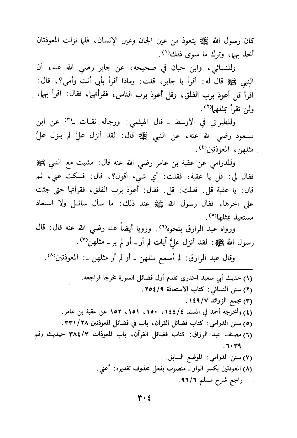 مسعود رضي الله عنه، عن النبي - صلى الله عليه وسلم - قال: لقد أنزل عليَّ لم ينزل عليَّ مثلهن، المعوذتين.