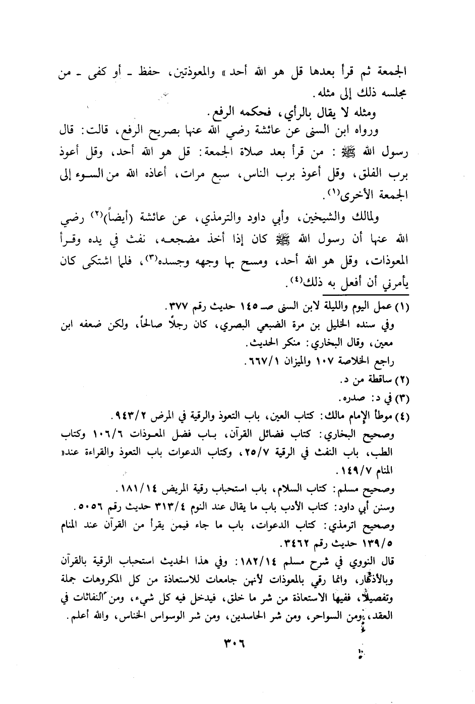 الله عنها أن رسول الله - صلى الله عليه وسلم - كان إذا أخذ مضجعه، نفث في يده وقرأ المعوذات، وقل هو الله أحد، ومسح بها وجهه وجسده، فلما اشتكى كان يأمرني أن أفعل به ذلك.