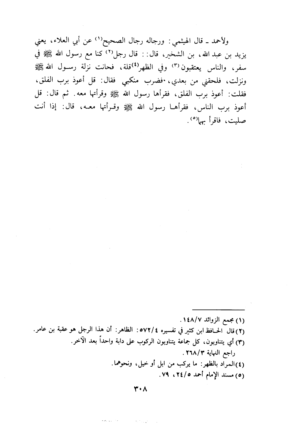 يزيد بن عبد الله، بن الشخير، قال:: قال رجل كنا مع رسول الله - صلى الله عليه وسلم - سفر، والناس يعتقبون وفي الظهر قلة، فحانت نزلة رسول الله - صلى الله عليه وسلم - ونزلت، فلحقني من بعدي، فضرب منكبي فقال: قل أعوذ برب الفلق، فقلت أعوذ برب الفلق، فقرأها رسول الله - صلى الله عليه وسلم - وقرأتها معه.