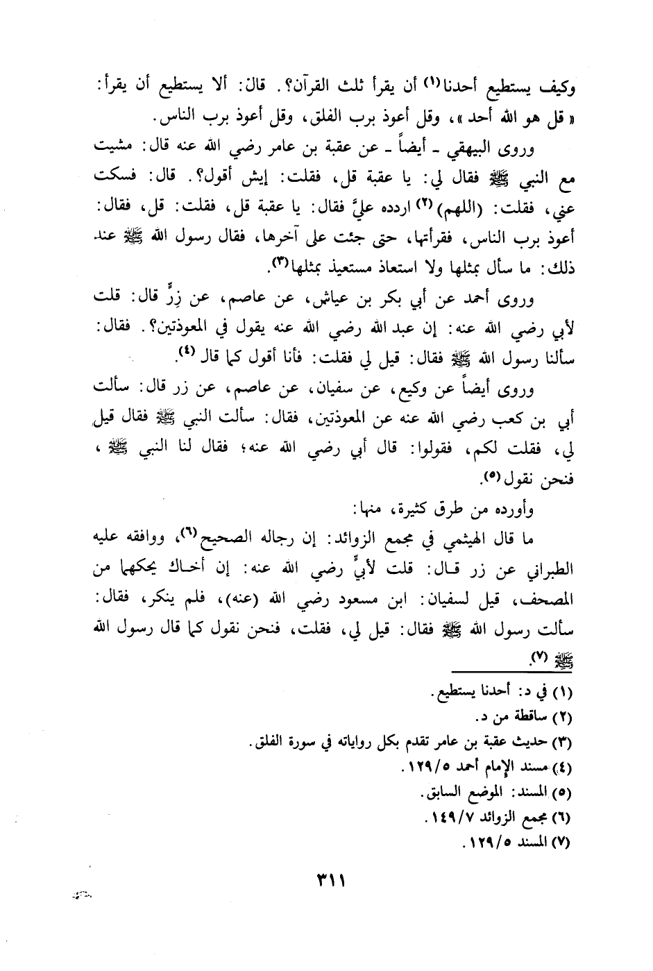 وأورده من طرق كثيرة، منها: ما قال الهيثمي في مجمع الزوائد: إن رجاله الصحيح، ووافقه عليه الطبراني عن زر قال: قلت لأبيٍّ رضي الله عنه: إن أخاك يحكهما من المصحف، قيل لسفيان: ابن مسعود رضي الله عنه، فلم ينكر، فقال: سألت رسول الله - صلى الله عليه وسلم - فقال: قيل لي، فقلت، فنحن نقول كما قال رسول الله - صلى الله عليه وسلم -