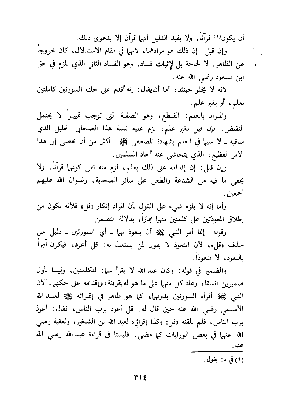 وقوله: إنما أمر النبي - صلى الله عليه وسلم - أن يتعوذ بهما - أي السورتين - دليل على حذف "قل"، لأن المتعوذ لا يقول لمن يستعيذ به: في أعوذ، فيكون آمِراً بالتعوذ، لا متعوذاً.