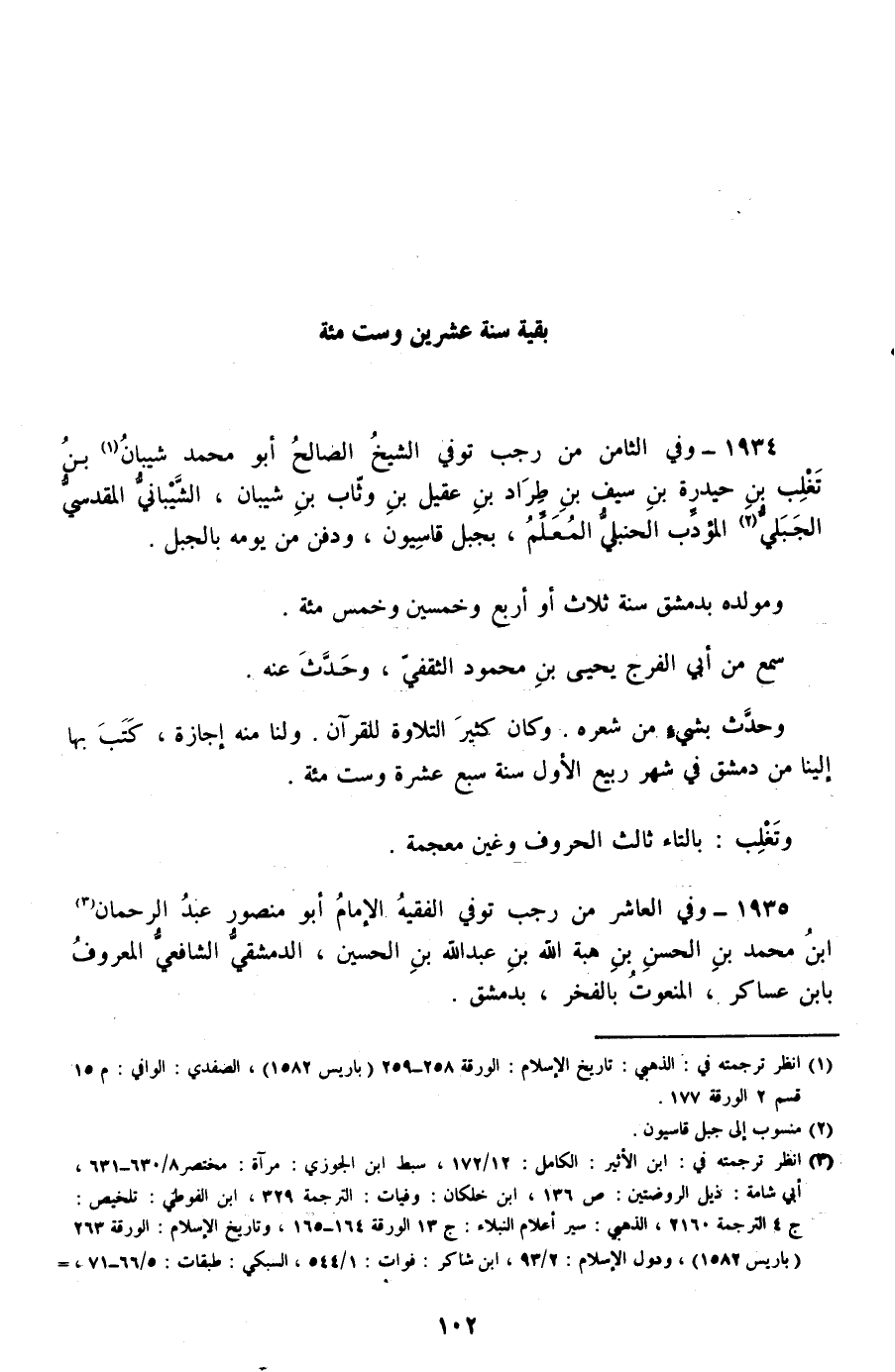 1934 - وفي الثامن من رجب توفي الشيخ الصالح أبو محمد شيبان بن تغلب بن حيدرة بن سيف بن طراد بن عقيل بن وثاب بن شيبان، الشيباني المقدسي الجبلي المؤدب الحنبلي المعلم، بجبل قاسيون، ودفن من يومه بالجبل.