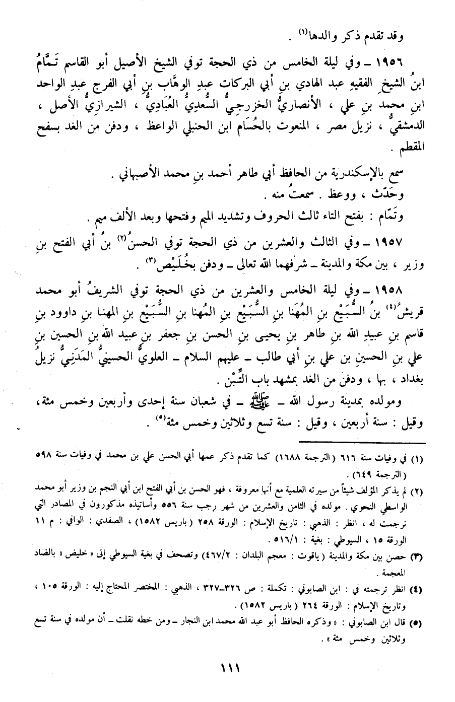 1958 - وفي ليلة الخامس والعشرين من ذي الحجة توفي الشريف أبو محمد قريش بن السبيع بن المهنا بن السبيع بن المهنا بن السبيع بن المهنا بن داوود بن قاسم بن عبيد الله بن طاهر بن يحيى بن الحسن بن جعفر بن عبيد الله بن الحسين بن علي بن الحسين بن علي بن أبي طالب –عليهم السلام- العلوي الحسيني المدني نزيل بغداد، بها، ودفن من الغد بمشهد باب التبن.