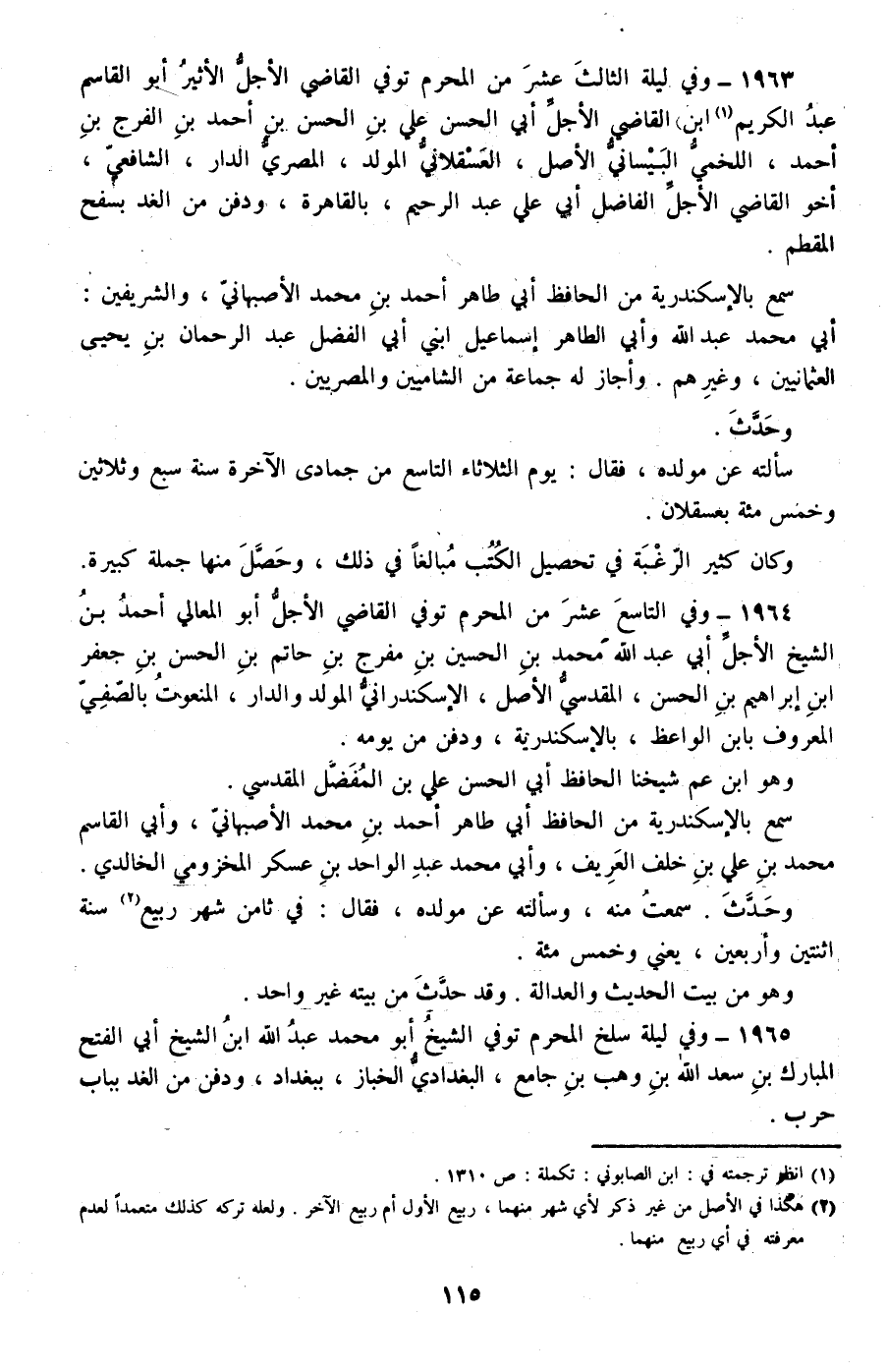 1965 - وفي ليلة سلخ المحرم توفي الشيخ أبو محمد عبد الله ابن الشيخ أبي الفتح المبارك بن سعد الله بن وهب بن جامع، البغدادي الخباز، ببغداد، ودفن من الغد باب حرب.