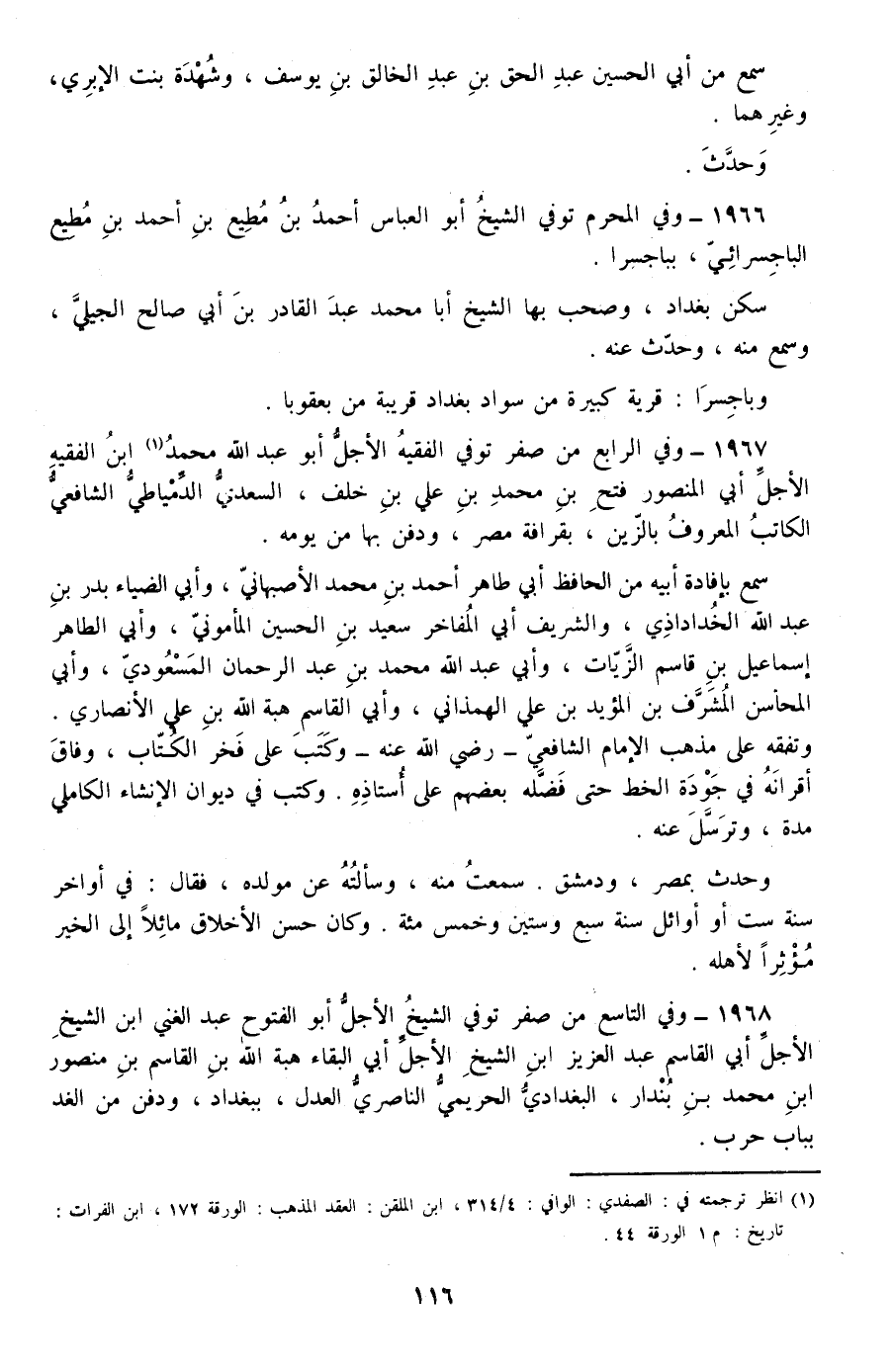 1968 - وفي التاسع من صفر توفي الشيخ الأجل أبو الفتوح عبد الغني ابن الشيخ الأجل أبي القاسم عبد العزيز ابن الشيخ الأجل أبي البقاء هبة الله بن القاسم بن منصور بن محمد بن بندار، البغدادي الحريمي الناصري العدل، ببغداد، ودفن من الغد بباب حرب.
