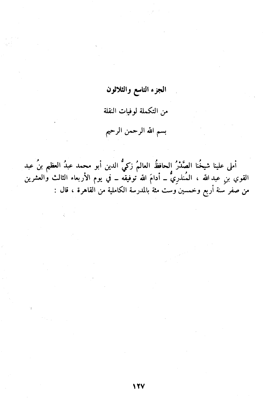 أملى علينا شيخنا الصدر الحافظ العالم زكي الدين أبو محمد عبد العظيم بن عبد القوي بن عبد الله، المنذري –أدام الله توفيقه- في يوم الأربعاء الثالث والعشرين من صفر سنة أربع وخمسين وست مئة بالمدرسة الكاملية من القاهرة، قال: