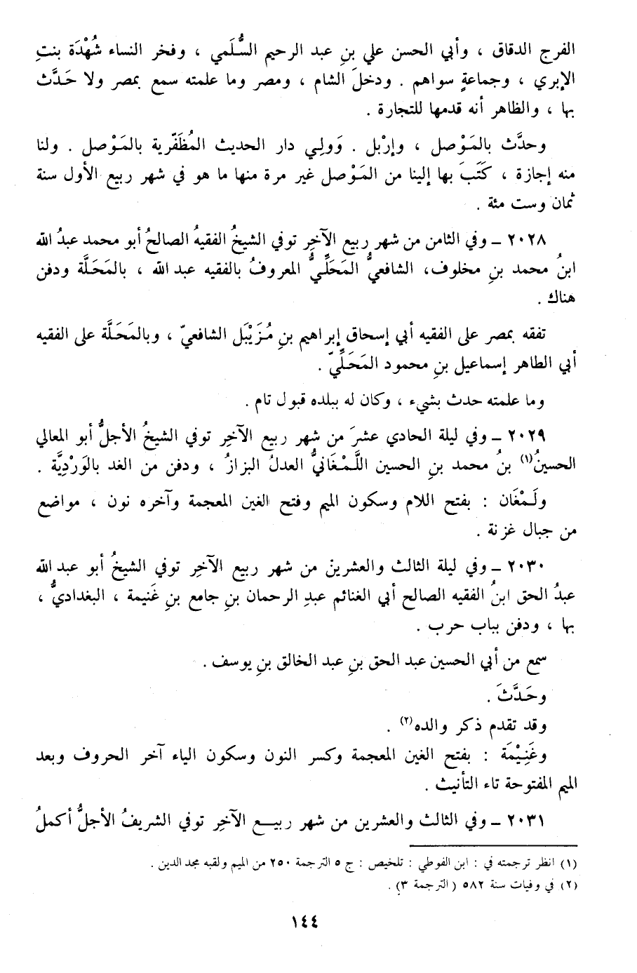 2030 - وفي ليلة الثالث والعشرين من شهر ربيع الآخر توفي الشيخ أبو عبد الله عبد الحق ابن الفقيه الصالح أبي الغنائم عبد الرحمان بن جامع بن غنيمة، البغدادي، بها، ودفن بباب حرب.