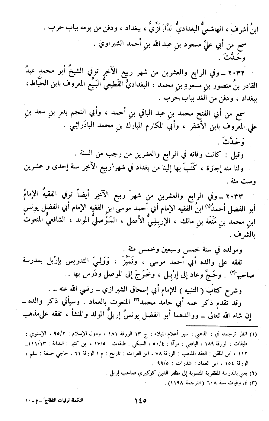 2033 - وفي الرابع والعشرين من شهر ربيع الآخر أيضا توفي الفقيه الإمام أبو الفضل أحمد ابن الفقيه الإمام أبي أحمد موسى ابن الفقيه الإمام أبي الفضل يونس بن محمد بن منعة بن مالك، الإربلي الأصل، الموصلي المولد، الشافعي المنعوت بالشرف