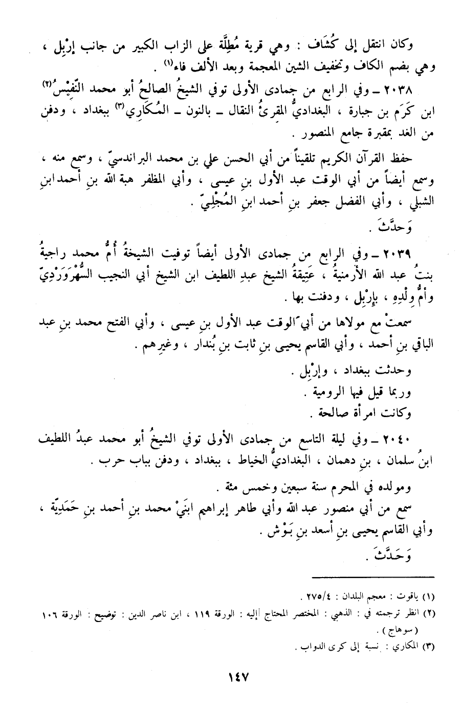 2038 - وفي الرابع من جمادى الأولى توفي الشيخ الصالح أبو محمد النفيس بن كرم بن جبارة، البغدادي المقرئ النقال -بالنون- المكاري، ببغداد، ودفن من الغد بمقبرة جامع المنصور.