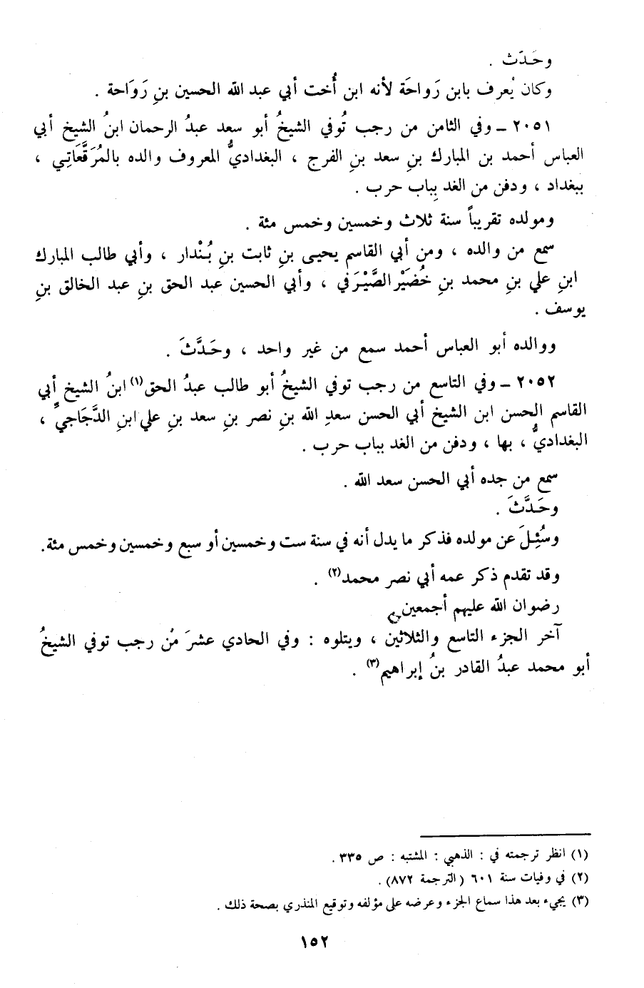 2051 - وفي الثامن من رجب توفي الشيخ أبو سعد عبد الرحمان ابن الشيخ أبي العباس أحمد بن المبارك بن سعد بن الفرج، البغدادي المعروف والده بالمرقعاتي، ببغداد، ودفن من الغد بباب حرب.