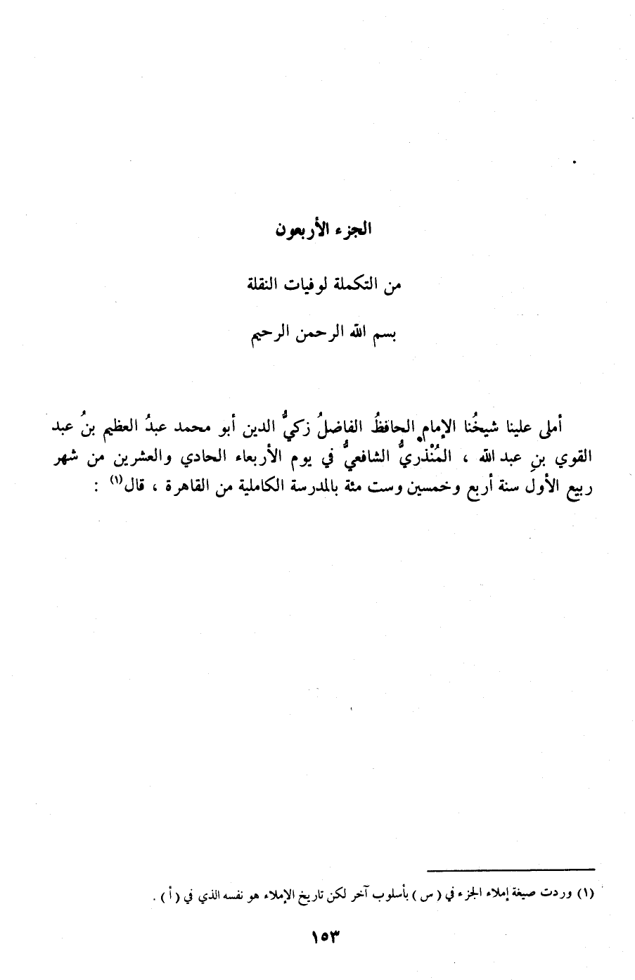 أملى علينا شيخنا الإمام الحافظ الفاضل زكي الدين أبو محمد عبد العظيم بن عبد القوي بن عبد الله، المنذري الشافعي في يوم الأربعاء الحادي والعشرين من شهر ربيع الأول سنة أربع وخمسين وست مئة بالمدرسة الكاملية من القاهرة، قال: