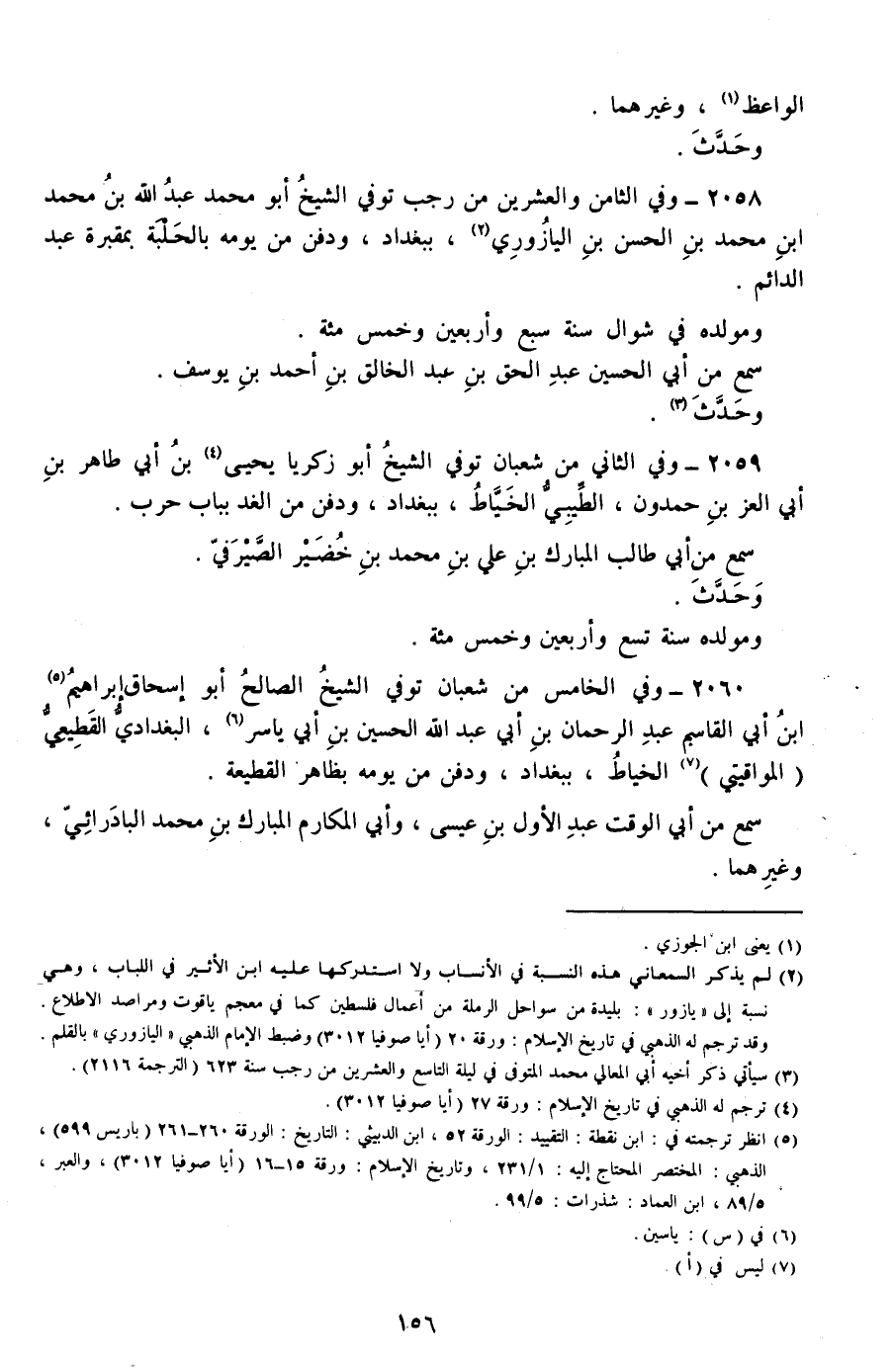 2058 - وفي الثامن والعشرين من رجب توفي الشيخ أبو محمد عبد الله بن محمد بن محمد بن الحسن بن اليازوري، ببغداد، ودفن من يومه بالحلبة بمقبرة عبد الدائم.