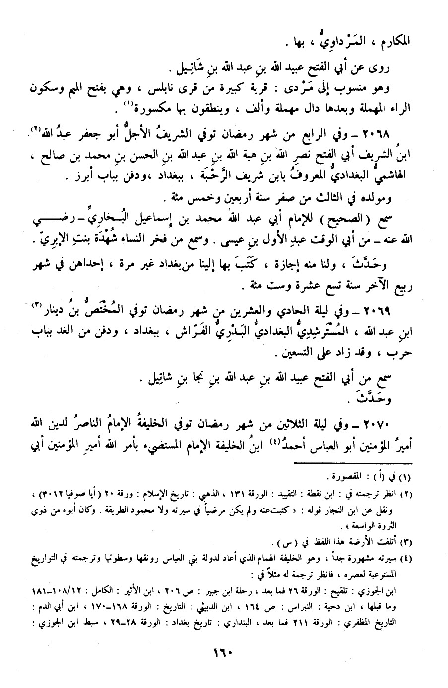 2069 - وفي ليلة الحادي والعشرين من شهر رمضان توفي المختص بن دينار بن عبد الله، المسترشدي البغدادي البدري الفراش، ببغداد، ودفن من الغد بباب حرب، وقد زاد على التسعين.