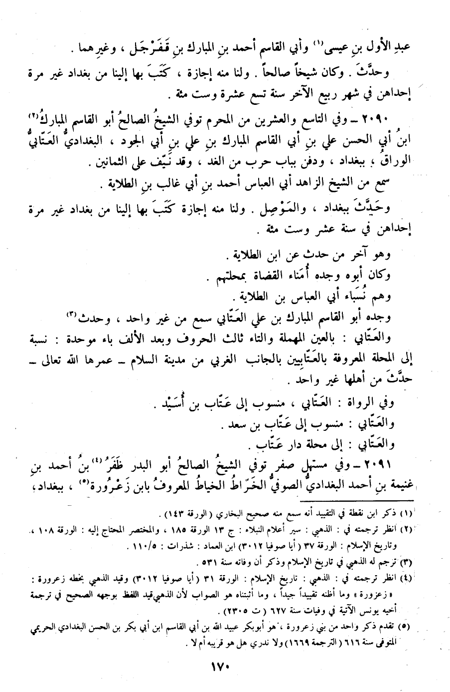2090 - وفي التاسع والعشرين من المحرم توفي الشيخ الصالح أبو القاسم المبارك بن أبي الحسن علي بن أبي القاسم المبارك بن علي بن أبي الجود، البغدادي العتابي الوراق، ببغداد، ودفن بباب حرب من الغد، وقد نيف على الثمانين.