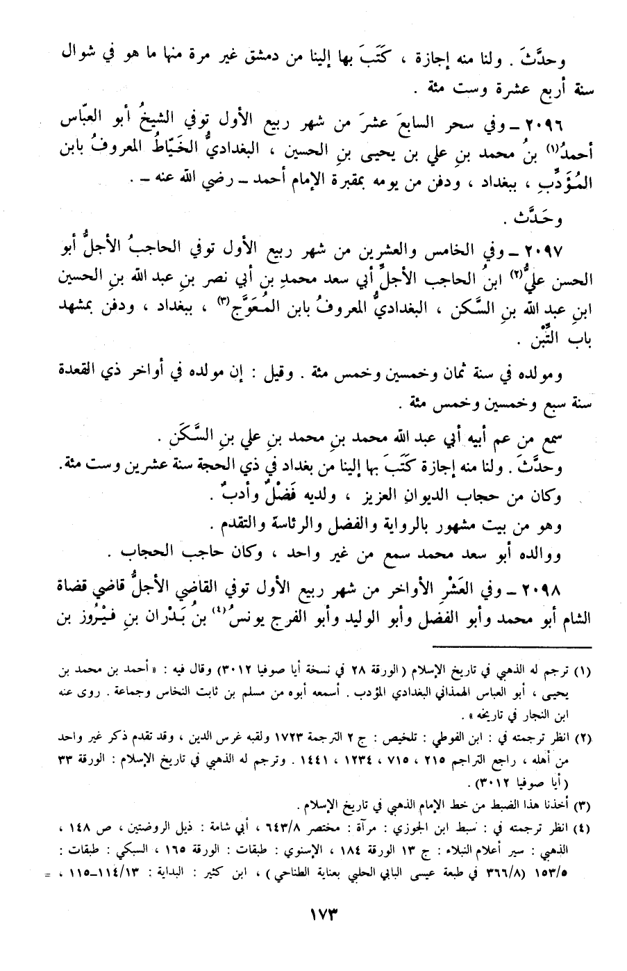 2096 - وفي سحر السابع عشر من شهر ربيع الأول توفي الشيخ أبو العباس أحمد بن محمد بن علي بن يحيى بن الحسين، البغدادي الخياط المعروف بابن المؤدب، ببغداد، ودفن من يومه بمقبرة الإمام أحمد –رضي الله عنه-.