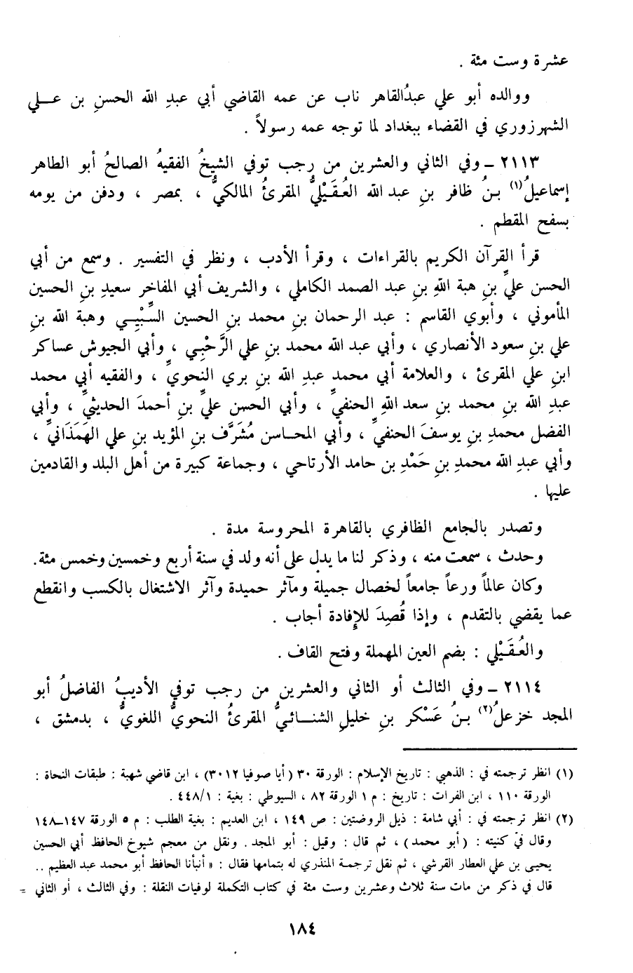 2113 - وفي الثاني والعشرين من رجب توفي الشيخ الفقيه الصالح أبو الطاهر إسماعيل بن ظافر بن عبد الله العقيلي المقرئ المالكي، بمصر، ودفن من يومه بسفح المقطم.