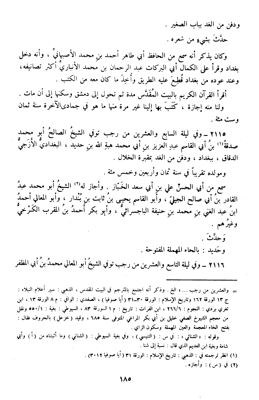 2115 - وفي ليلة السابع والعشرين من رجب توفي الشيخ الصالح أبو محمد صدقة بن أبي القاسم عبد العزيز بن أبي محمد هبة الله بن حديد، البغدادي الأزجي الدقاق، ببغداد، ودفن من الغد بمقبرة الخلال.
