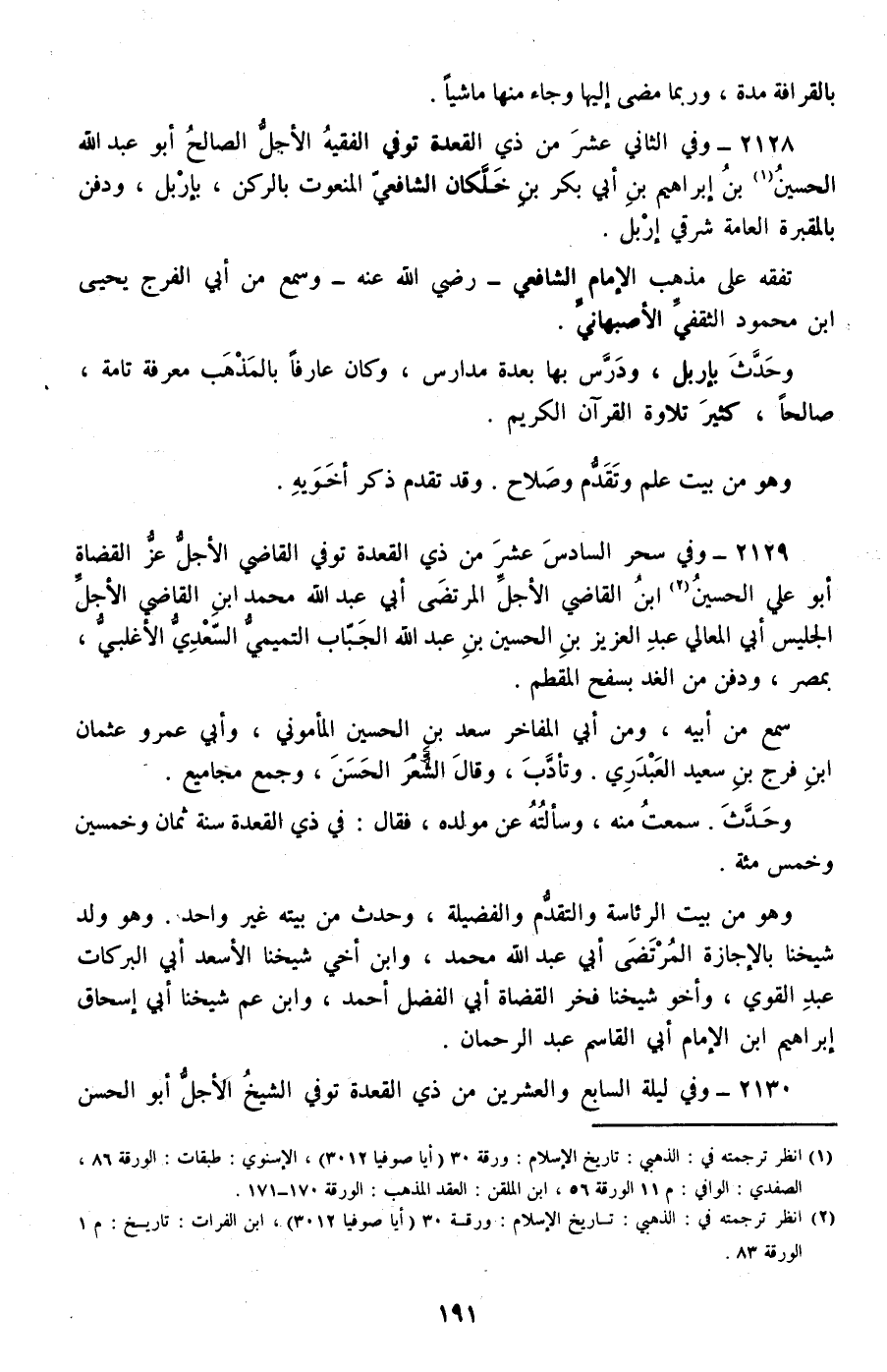 2128 - وفي الثاني عشر من ذي القعدة توفي الفقيه الأجل الصالح أبو عبد الله الحسين بن إبراهيم بن أبي بكر بن خلكان الشافعي المنعوت بالركن، بإربل، ودفن بالمقبرة العامة شرقي إربل.