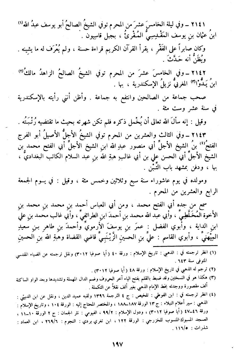 2143 - وفي الثالث والعشرين من المحرم توفي الشيخ الأجل الأصيل أبو الفرج الفتح بن الشيخ الأجل أبي منصور عبد الله ابن الشيخ الأجل أبي الفتح محمد بن الشيخ الأجل أبي الحسن علي بن أبي غالب هبة الله بن عبد السلام الكاتب البغدادي، بها، ودفن بمشهد باب التبن.