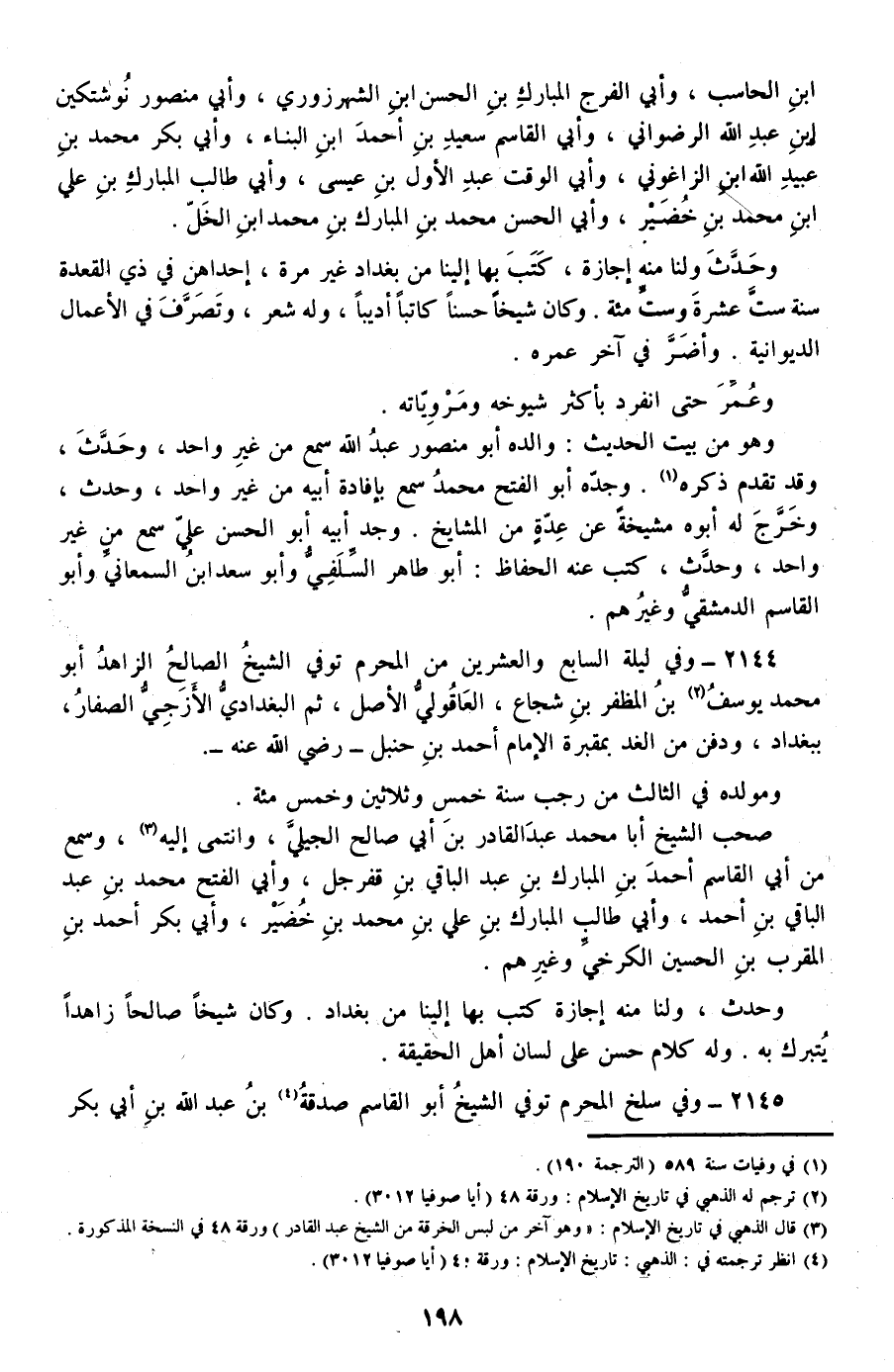 2144 - وفي ليلة السابع والعشرين من المحرم توفي الشيخ الصالح الزاهد أبو محمد يوسف بن المظفر بن شجاع، العاقولي الأصل، ثم البغدادي الأزجي الصفار، ببغداد، ودفن من الغد بمقبرة الإمام أحمد بن حنبل –رضي الله عنه-.
