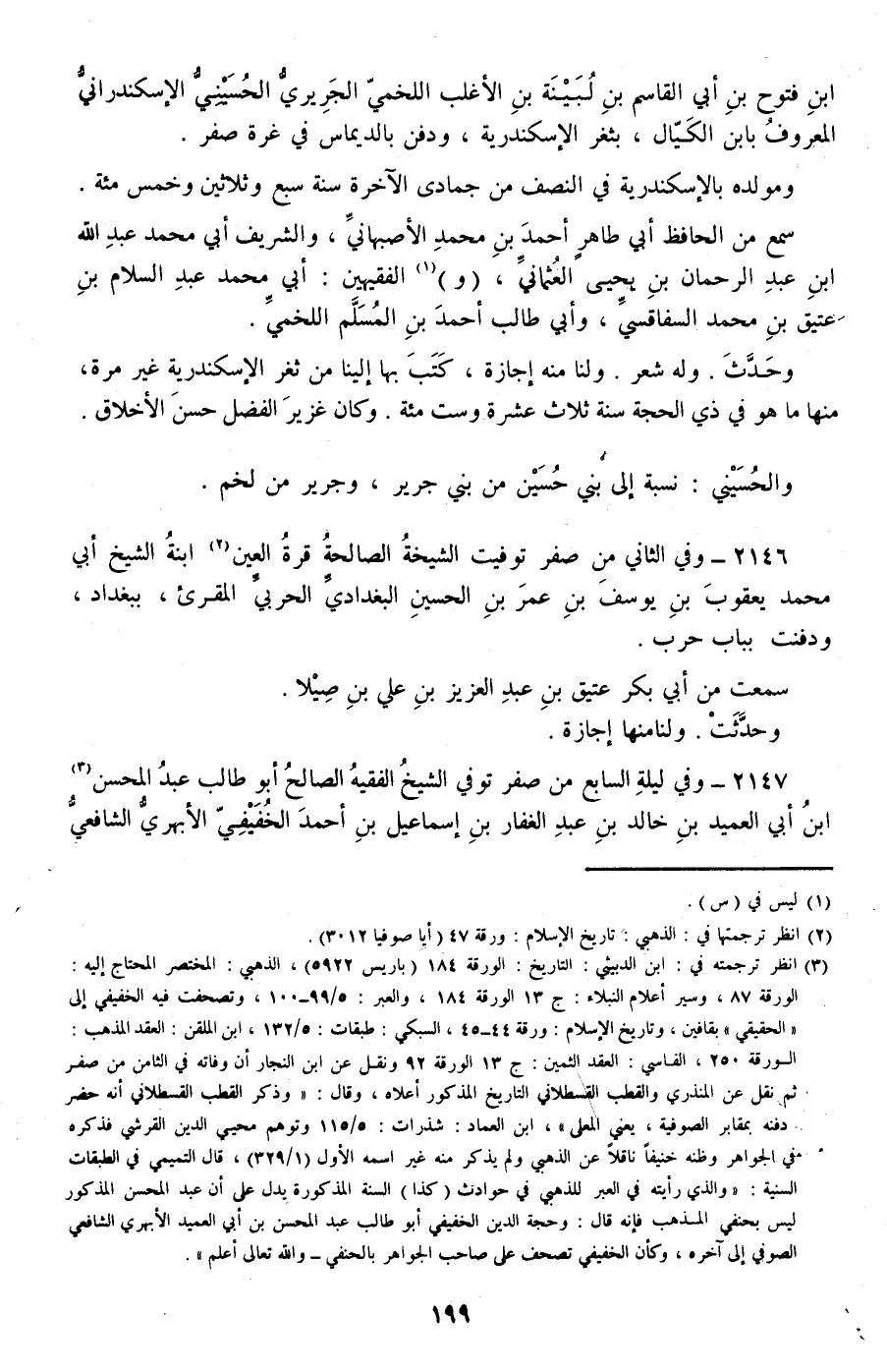 2147 - وفي ليلة السابع من صفر توفي الشيخ الفقيه الصالح أبو طالب عبد المحسن بن أبي العميد بن خالد بن عبد الغفار بن إسماعيل بن أحمد الخفيفي الأبهري الشافعي الصوفي المعروف بالحجة، #200# بمكة –شرفها الله تعالى- وصلي عليه بالحرم الشريف، ودفن بالمعلى.
