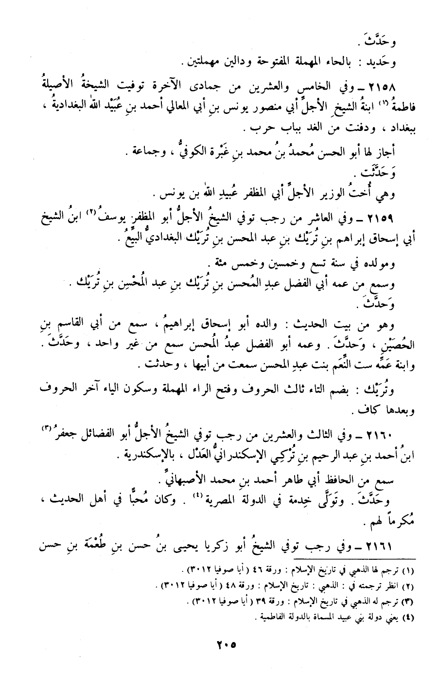 2161 - وفي رجب توفي الشيخ أبو زكريا يحيى بن حسن بن طعمة بن حسن البغدادي الدارقزي الوراق، #206# بدار القز، ودفن عند قبر إبراهيم الحربي.